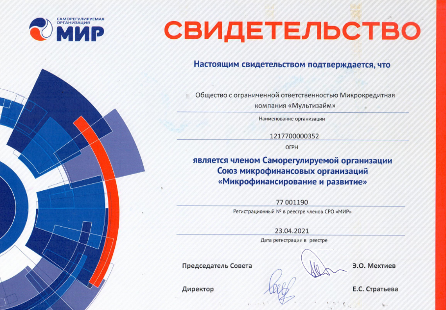 ООО МКК "Мультизайм" с 23.04.2021г. является членом СРО "МИР" (107078, г. Москва Орликов переулок, д.5, стр.1, этаж 2, пом.11)